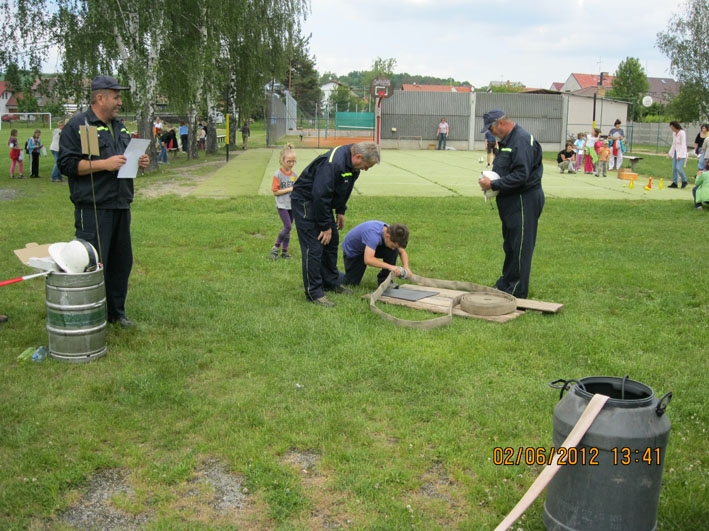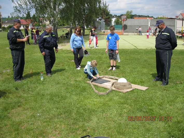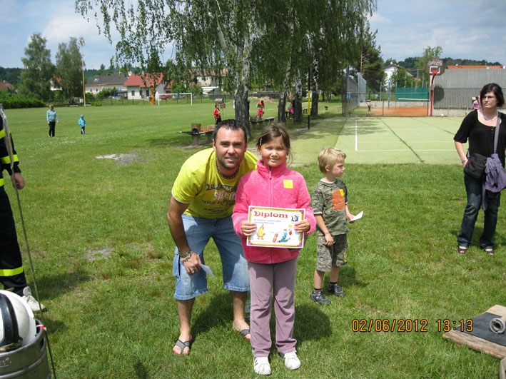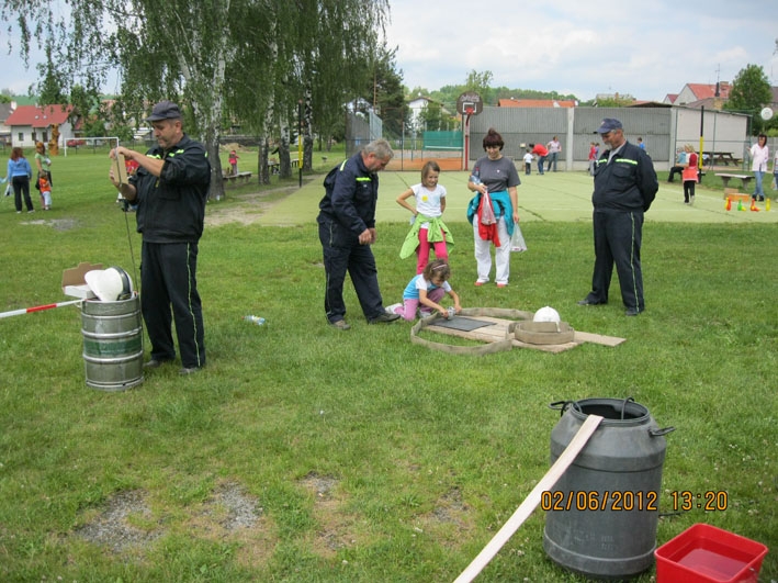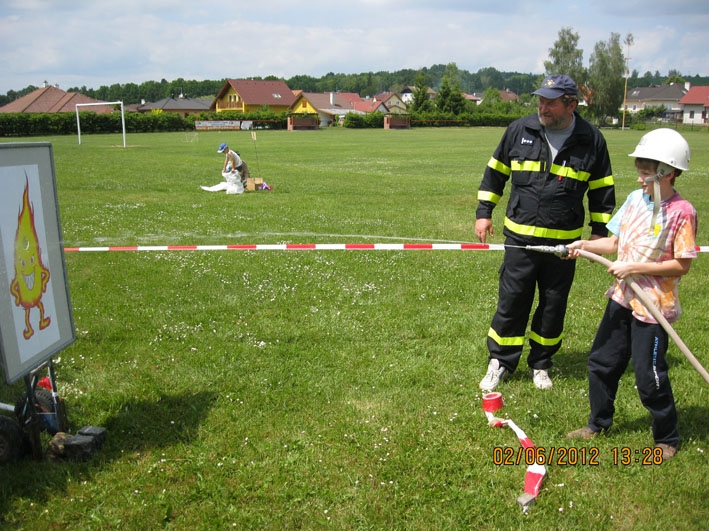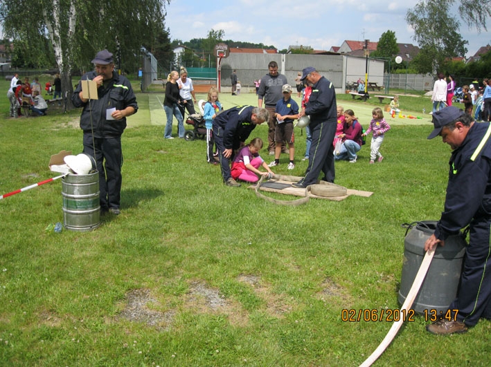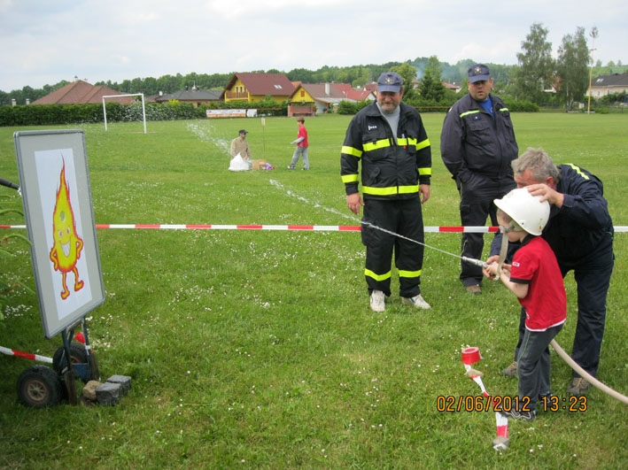Dne 2.6.2012 proběhl Den dětí na fotbalovém hřišti v Nové Vsi. Jako každý rok bylo pro děti připraveno mnoho zábavných a sportovních akcí. Jednou z nich bylo i stanoviště SDH Nová Ves, kde děti bez rozdílu věku dostaly za úkol spojit hadici C, nasadit si hasičskou přilbu a pomocí proudnice D, připojené na malé čerpadlo, "uhasit" zlý plamínek Páliveček. Na tabuli s obrázkem plamínku byl malý otvor, za ním postaven dřevěný hranolek, který musely děti tímto otvůrkem proudem vody shodit a tím byly jejich úkoly splněny. Líbilo se nám, s jakou vážností a zapálením se děti snažily vše zvládnout co nejlépe a co nejrychleji. A jako důkaz, že hasičské úkoly splnily (ti nejmenší s naší pomocí), dostaly za odměnu diplom věnovaný naším hasičským sborem. Členů našeho sboru se sešlo mnoho a proto jsme pomáhali i na dalších stanovištích. Den dětí se vydařil, počasí nám přálo a tak si to všichni náramně užili.