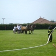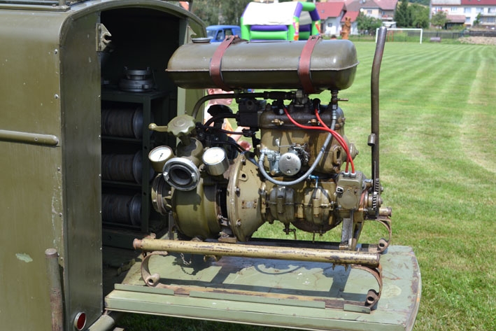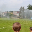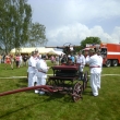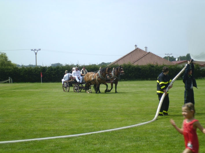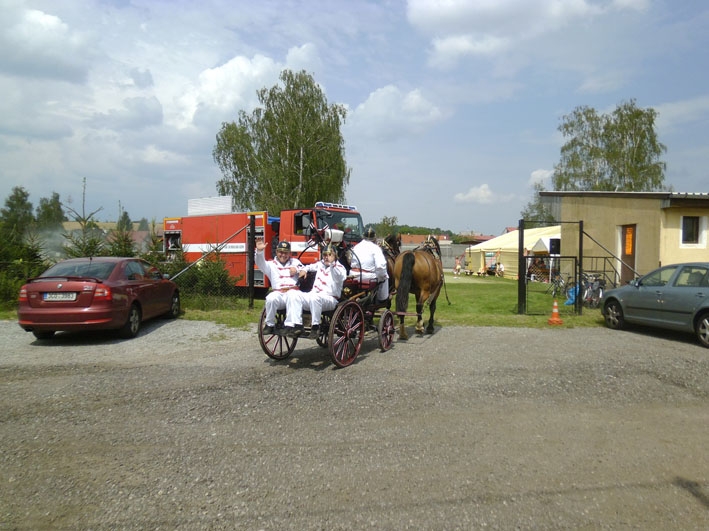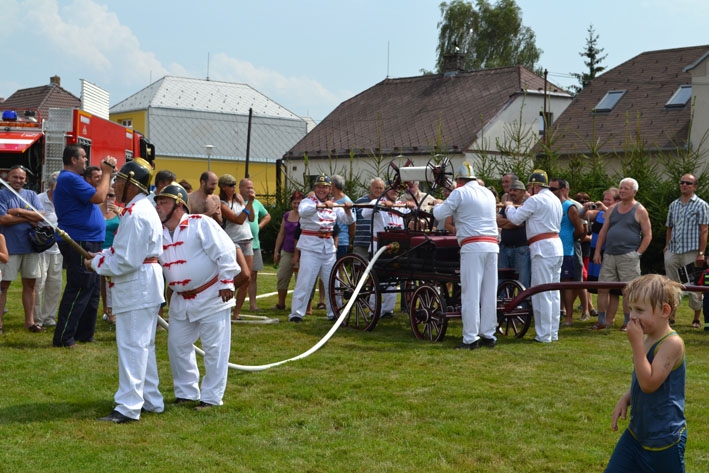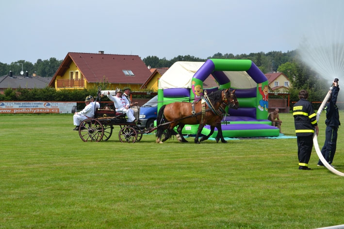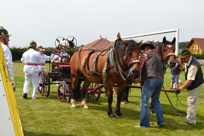 Na závěr jsme si připravili pro diváky překvapení - dokončili jsme rekonstrukci staré vahadlové stříkačky z roku 1898 a přivezli ji na hřiště taženou koňským spřežením. Byli jsme oblečení do dobových hasičských uniforem včetně přileb a opasků (poděkování členům městského HZS, kteří nám toto zapůjčili) a předvedli, jak stará stříkačka ještě funguje. Ta se potom stala hlavním bodem zájmu pro dospělé a hlavně povyražením pro děti všeho věku, které si chtěly vyzkoušet pumpování a stříkání vody.