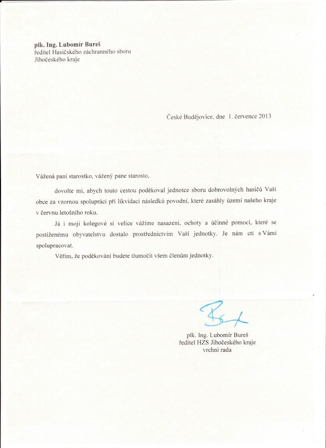 Dopis od řiditele HZS Jihočeského kraje